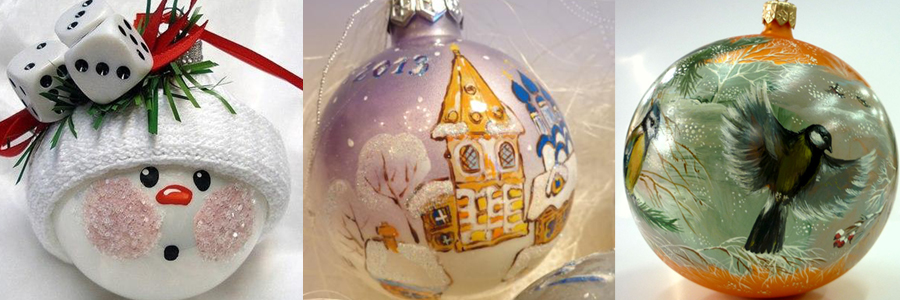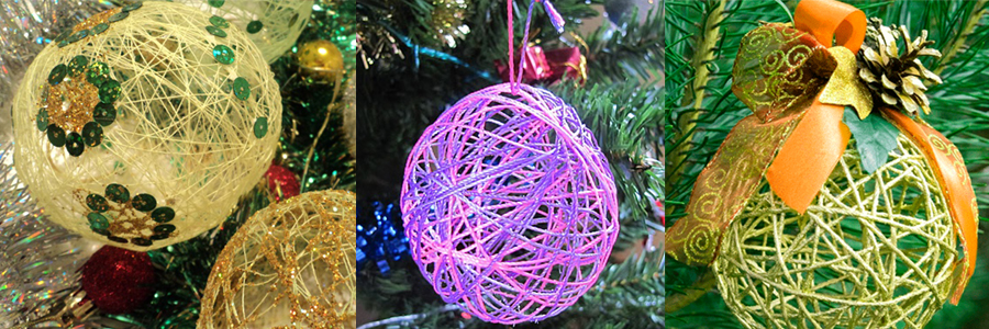 Есть еще один способ, как сделать оригинальные украшения на елку. Для этого понадобятся нитки разных размеров и толщины, воздушный шарик, клей. Сначала нужно надуть шарик до желаемого размера, после этого тщательно обмазать его клеем и начать наматывать вокруг него нитку. Такая игрушка должна хорошо высохнуть, после этого шарик прокалываем и извлекаем из застывшей игрушки. Дополнительно такая игрушка может быть декорирована стразами или другими блестящими элементами. Если нитки использовались только белого цвета, то после того, как игрушка примет нужную форму, ее следует разукрасить разными красками, учитывая пристрастия символа наступающего года. В подарок родным можно изготовить набор елочных игрушек красного, оранжевого, желтого, золотистого цвета. Такие украшения очень хорошо выглядят на лесной красавице, поэтому можно смело экспериментировать.