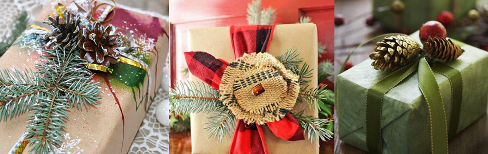 — оборачиваем и завязываем бечевкой или ленточкой и сверху при помощи проволоки и бечевки прикрепляем еловые шишки и веточки. Акриловая краска, разбрызганная сверху, станет имитацией снега. Можно просто красиво привязать еловую веточку к коробке;