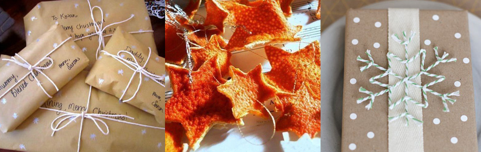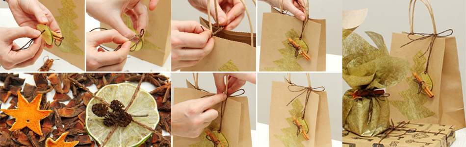 Высушенные в духовки колечки цитрусовых – апельсинов, лимонов, лаймов, и палочки корицы станут самым ароматным и необычным средством для декора. Можно скрепить такое ароматное цитрусовое колечко с коричной палочкой при помощи бечевки и красиво украсить пакет.